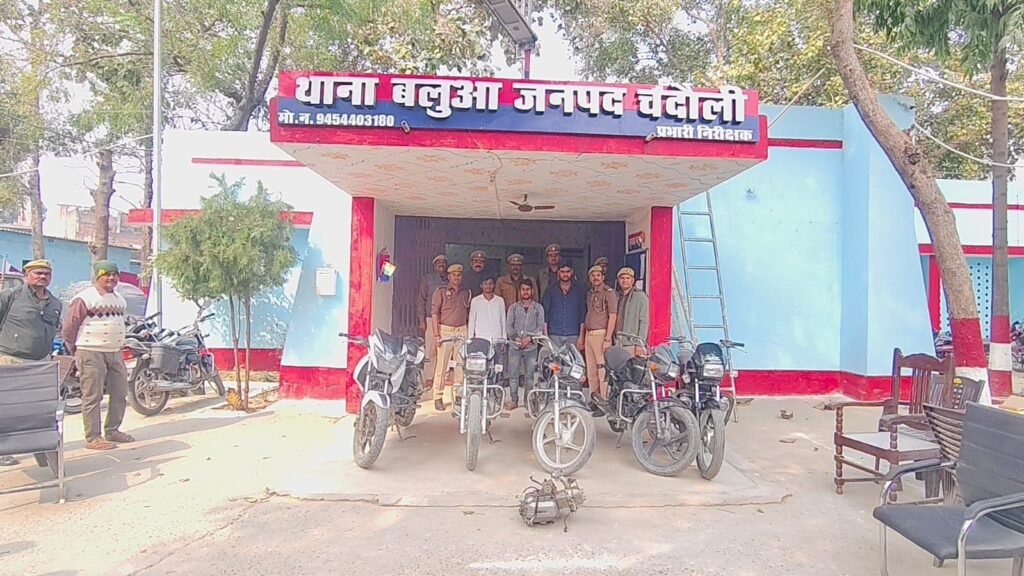 चंदौली— जिले में बलुआ पुलिस ने बाइक गिरोह का पर्दाफाश कर तीन अंतर्राज्यीय बाइक चोरों को गिरफ्तार किया है. उनके कब्जे से कुल पांच मोटरसाइकिल और एक इंजन जब्त की गई हैं, आरोपियों ने चोरी की मोटरसाइकिलें बेचने के लिए ग्राहक तलाश रहे थे, तभी पुलिस ने उन्हें दबोच लिया. पुलिस ने सभी आरोपियों को बलुआ थाना क्षेत्र राधे की मड़ई के समीप से गिरफ्तार करने में सफलता पाई है.