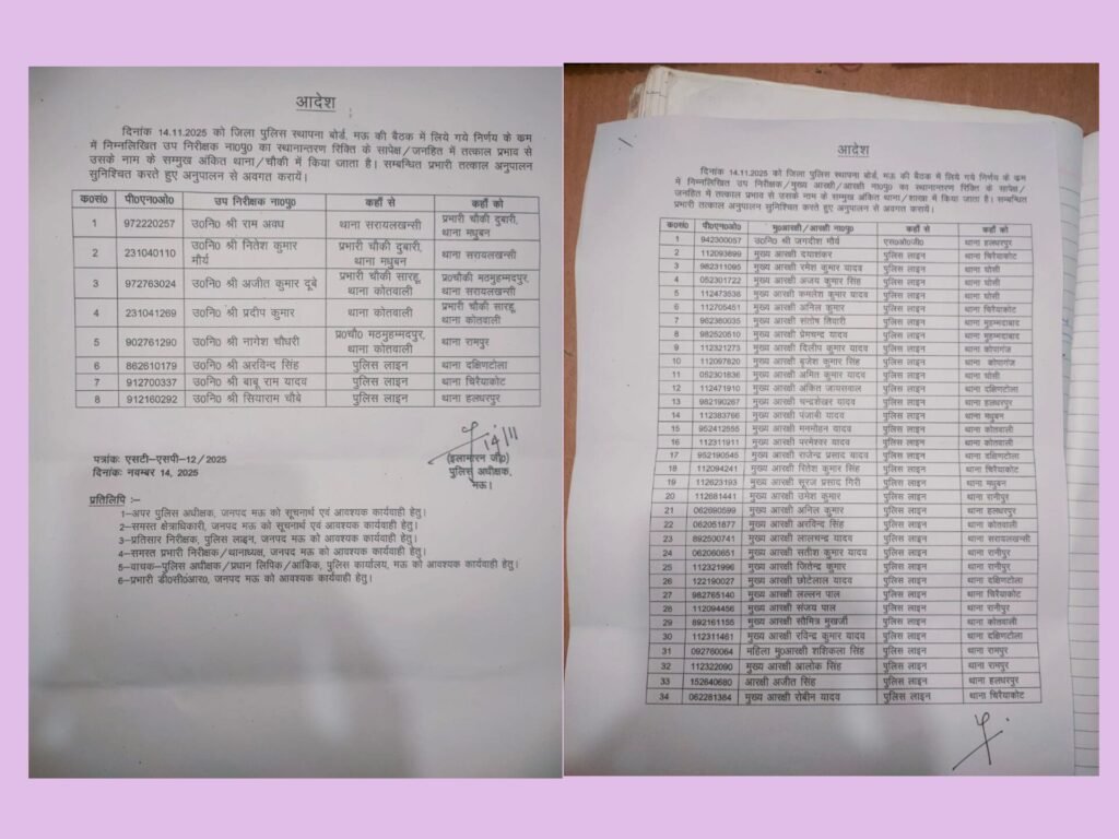 मऊ: पुलिस अधीक्षक इलामारन जी ने गैर जनपद से स्थानांतरित होकर आए 9 दारोगा और 57 हेड कांस्टेबल व कांस्टेबल को पुलिस लाइन से थानों में तैनाती दी है. पिछले दिनों अलग-अलग जनपदों से स्थानांतरित होकर जिले में आए उप-निरीक्षक,आरक्षी व मुख्य आरक्षी को तैनाती का इंतजार था. उनको पुलिस स्थापना बोर्ड की बैठक के बाद अलग-अलग थाने में तैनाती दी गई है. सभी को तत्काल प्रभाव से अपने नवीन तैनाती स्थल पर कार्यभार ग्रहण करने के लिए पुलिस अधीक्षक ने निर्देश दिए हैं.