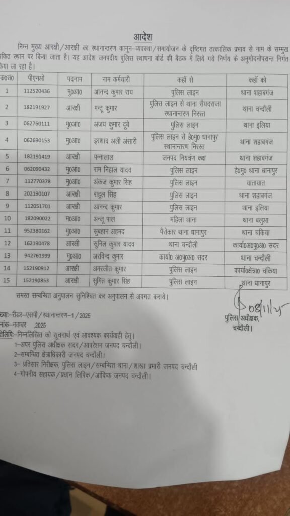 चंदौली: जिले में कानून-व्यवस्था को दुरुस्त बनाने के लिए पुलिस महकमे में बड़ा फेरबदल किया गया है. पुलिस अधीक्षक आदित्य लांघे ने शनिवार को 15 पुलिसकर्मियों का स्थानांतरण आदेश जारी री किया. इसमें आरक्षी और मुख्य आरक्षी स्तर के पुलिसकर्मी शामिल हैं. तबादले के बाद सभी पुलिसकर्मियों को तत्काल प्रभाव से नई तैनाती स्थल पर कार्यभार संभालने के निर्देश दिए गए हैं.