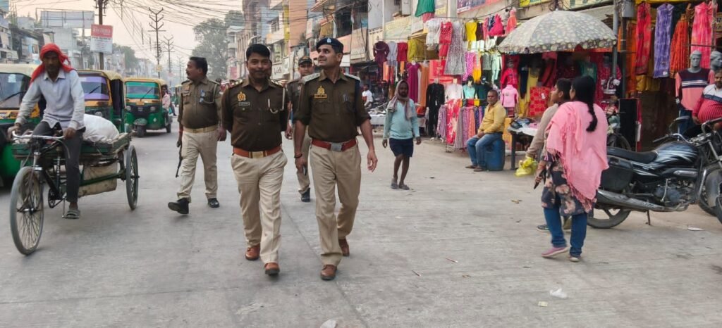 कस्बे में पैदल गस्त करते अधिकारी