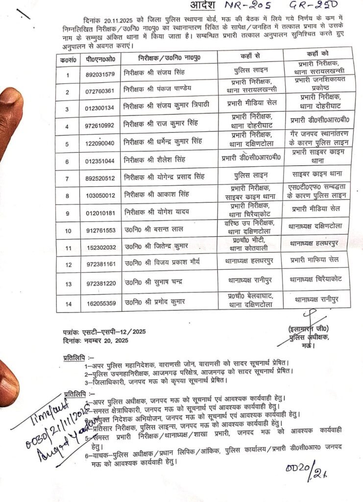 MAU News: पुलिस कप्तान इलामारन जी ने चलाई ‘तबादला एक्सप्रेस’, नौ निरीक्षक सहित पांच थानाध्यक्षों के कार्यक्षेत्र में बदलाव: किसे कहां मिली तैनाती? देखें यहां
