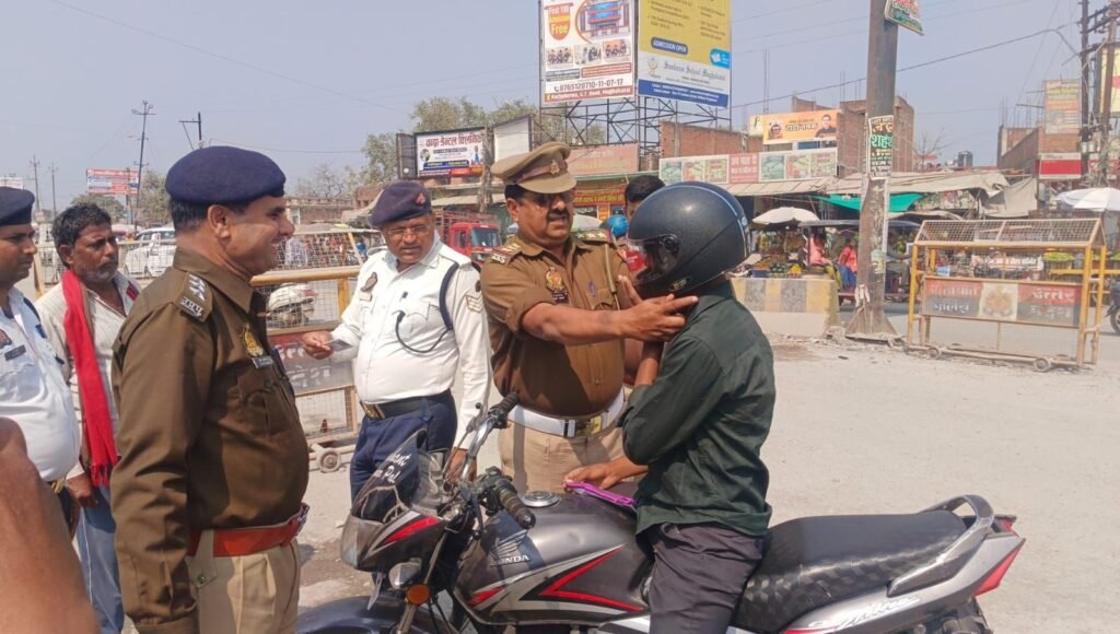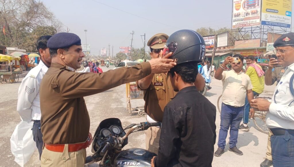 बाइक सवार को हेलमेट लगाकर प्रेरित करते यातायात प्रभारी सत्य प्रकाश यादव —
